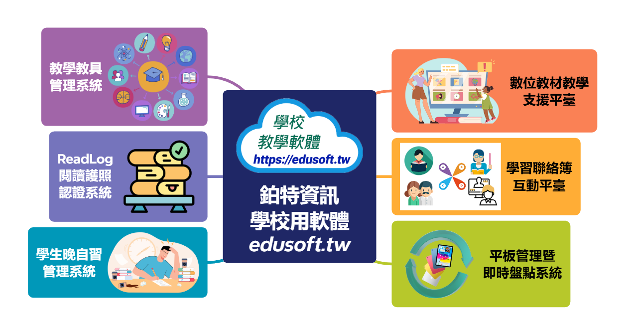 課堂教學軟體 序號:11312-038 自主學習運作平臺 課堂教學軟體 序號:11322-019 學習成果發表平臺 課堂教學軟體 序號:11322-020 閱讀心得投稿支援平臺 課堂教學軟體 序號:11322-021 小論文投稿支援平臺 課堂教學軟體 序號:11412-045 TVideo影音教學運作平臺 數位教材教學 支援平臺 學習聯絡簿 互動平臺 平板管理暨 即時盤點系統 學生晚自習 管理系統 ReadLog 閱讀護照 認證系統 教學教具 管理系統